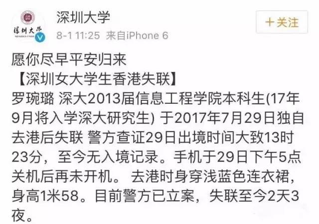 8月1日,微博上一则寻人启事引起了广泛关注,微博上称深圳大学女大学生罗婉璐在29日独自到香港后失联。警方查证后也称:出境时间为29日13时23分,至今无入境记录。