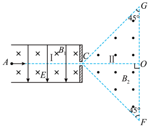 6. 如图,真空中有区域Ⅰ和Ⅱ,区域Ⅰ中存在匀强电场和匀强磁场,电场方向竖直向下(与纸面平行),磁场方向垂直纸面向里,等腰直角三角形CGF区域(区域Ⅱ)内存在匀强磁场,磁场方向垂直纸面向外。图中A、C、O三点在同一直线上,AO与GF垂直,且与电场和磁场方向均垂直。A点处的粒子源持续将比荷一定但速率不同的粒子射入区域Ⅰ中,只有沿直线AC运动的粒子才能进入区域Ⅱ。若区域Ⅰ中电场强度大小为E、磁感应强度大小为B1,区域Ⅱ中磁感应强度大小为B2,则粒子从CF的中点射出,它们在区域Ⅱ中运动的时间为t0。若改变电场或磁场强弱,能进入区域Ⅱ中的粒子在区域Ⅱ中运动的时间为t,不计粒子的重力及粒子之间的相互作用,下列说法正确的是( )