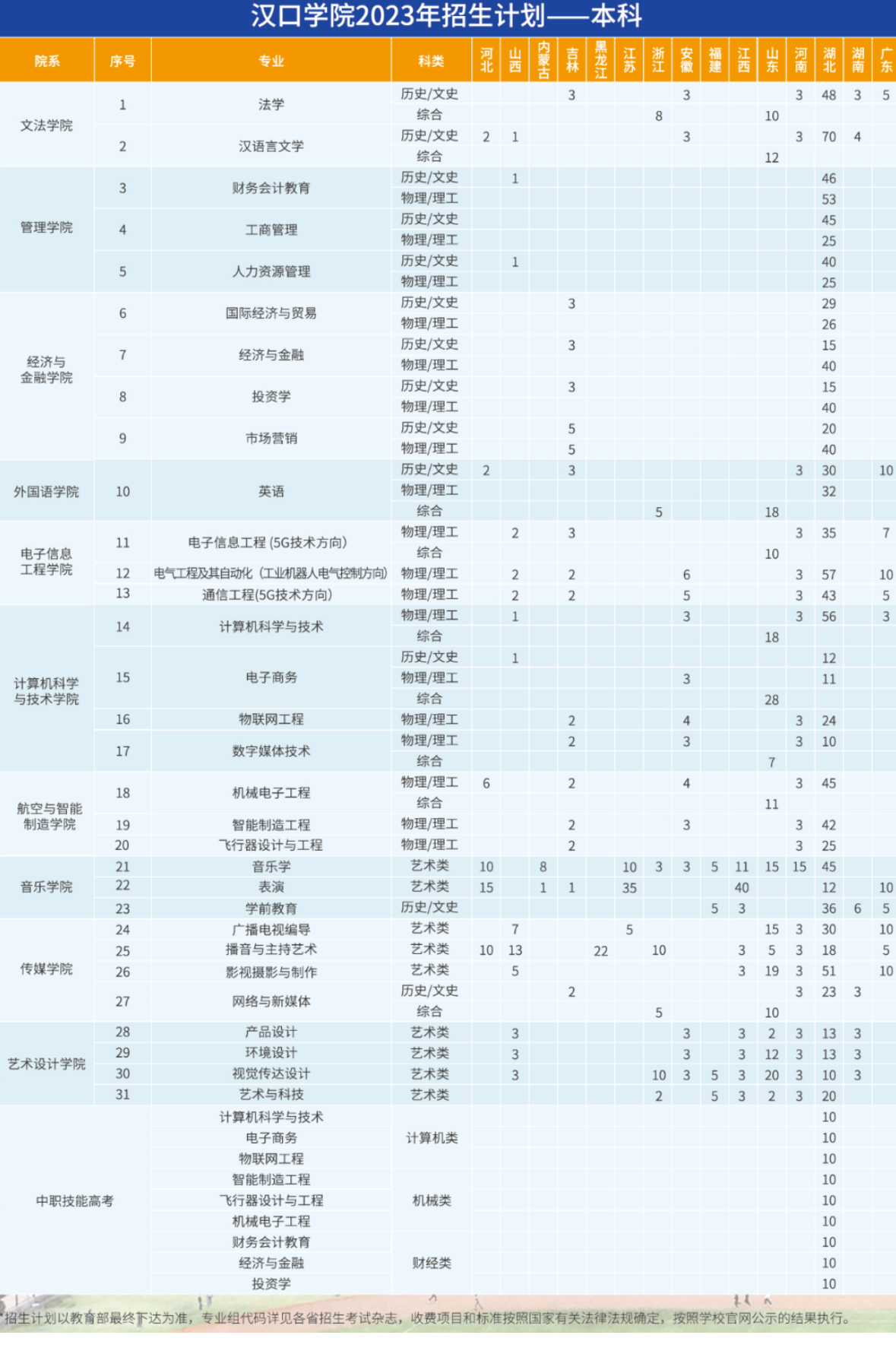 汉口学院2023年专业各省招生计划:在吉林招生计划中法学专业招生3人、经济与金融专业招生3人等。